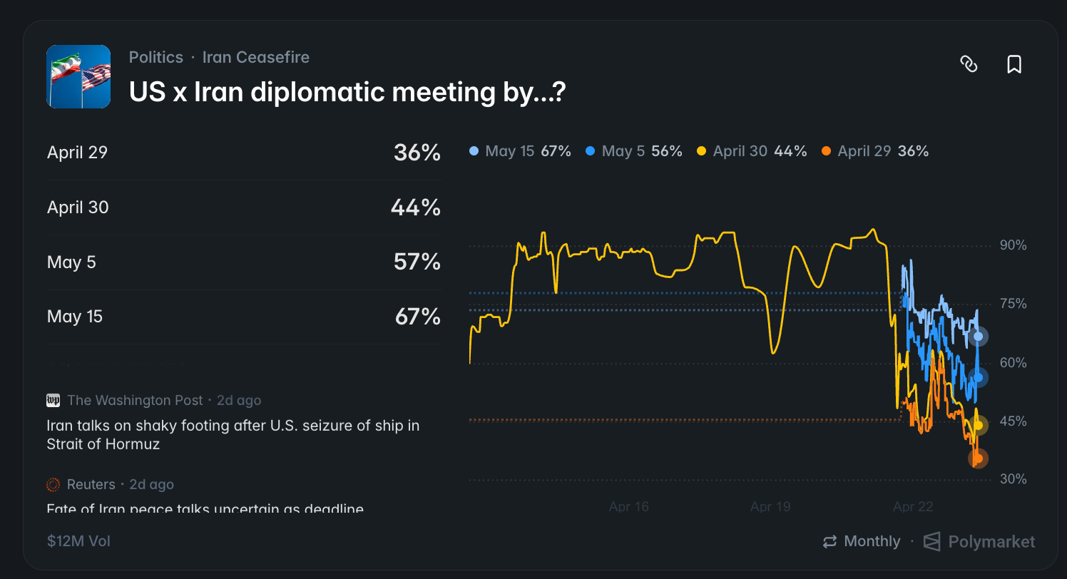 Polymarket odds currently sit at about 36% that a US x Iran diplomatic meeting takes place by April 29th.
