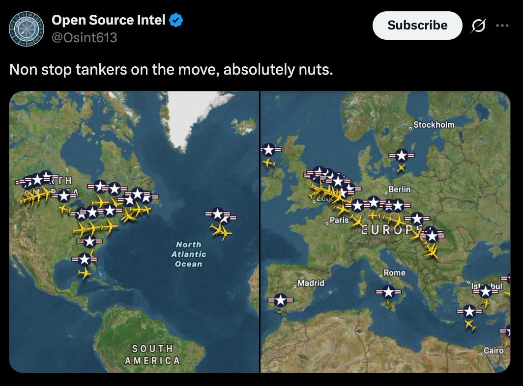 In the air, open source flight tracking (the latest OSINT mania on X) has shown a sustained surge of U.S. military aircraft flowing toward the region over the past several days. The standout detail isn’t just fighters, it’s the volume of KC-135 and KC-46 aerial refueling tankers.