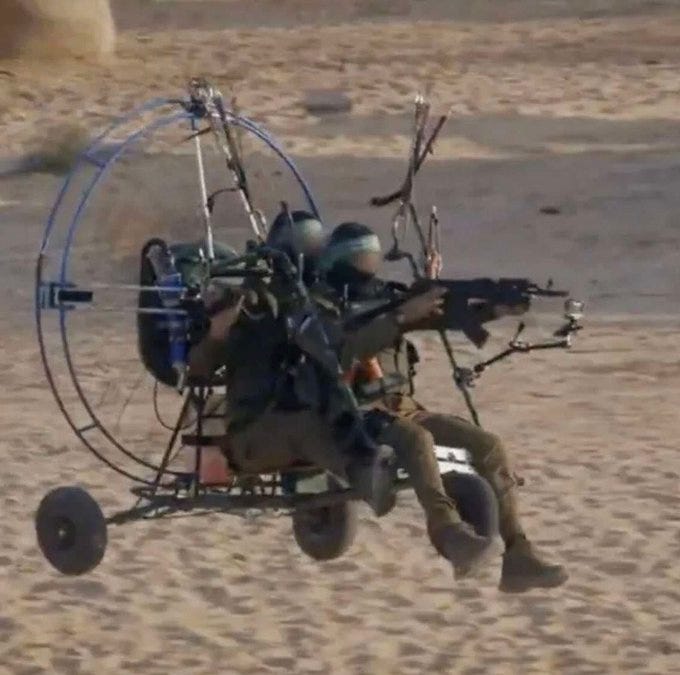 The Hamas militants struck by land air and sea. Para gliders (below), something straight out of a James Bond movie, overwhelmed regions across southern Israel — militants we now know, killed over 250 rave goers at an international EDM festival. Women were raped, people were tied up and executed with grenades and small arms fire, and many were kidnapped and taken directly back to Gaza as hostages.