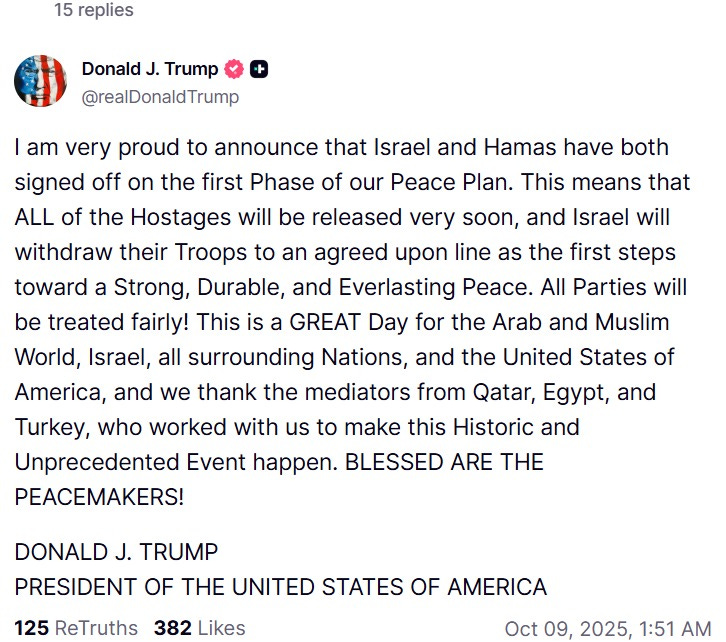 Global headlines this week were dominated by a rare relative moment of calm in the Middle East as Israel and Hamas agreed to a ceasefire, *allegedly* pausing two years of brutal conflict in Gaza and opening the door for renewed international diplomacy. Video on social media showed pockets of conflict still occurring.