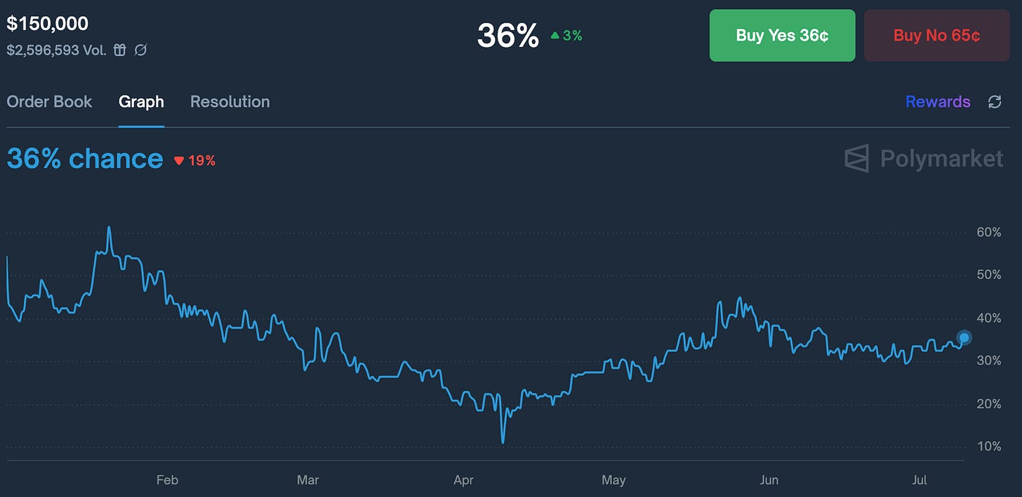 If you want a look into sentiment on price targets — Polymarket’s data has some good clues. As of last night there’s a 36% chance Bitcoin hits $150,000 in 2025.