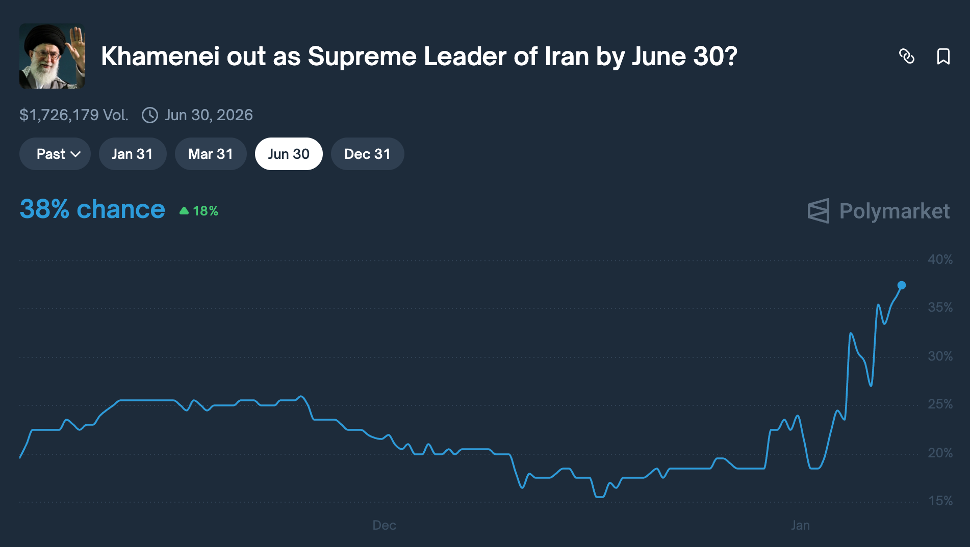 The country has seen a sharp escalation in unrest over the past 48 hours as protests driven by inflation, currency collapse, and rising food prices continue to spread nationwide. Polymarket odds for Khamenei out as the supreme leader of Iran by the summer are soaring, and now sitting at 38%. See them HERE.
