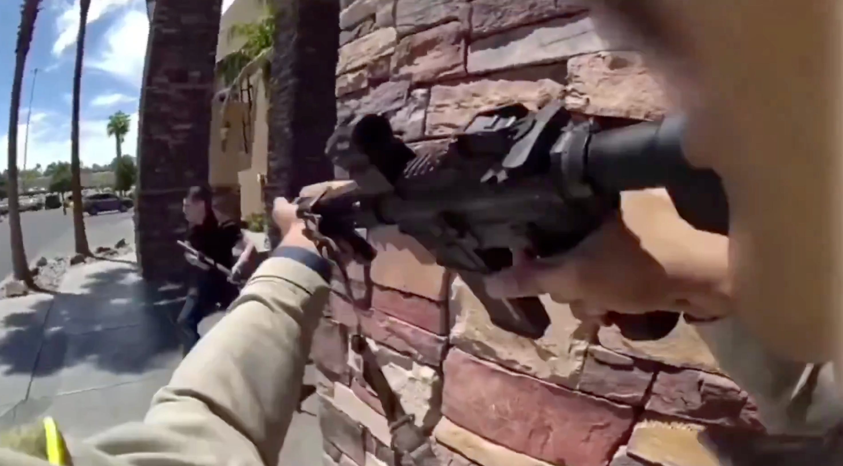 One of the officers waited behind a brick column and quickly dispatched the scumbag as he attempted to run out into the parking lot.