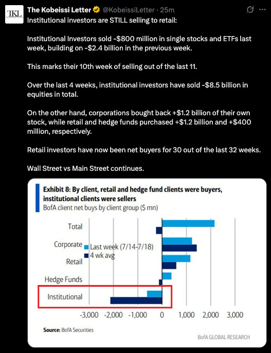 Some interesting data from the Kobeissi Letter in their X post below. It appears that institutional investors are continuing their aggressive selling despite retail continuing to pile into markets like lunatics.