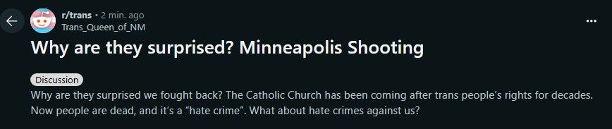 This event will continue to expand conversations about the targeting of Catholics and Christians by far left inspired groups in the US. Churches, schools, and other locations are soft target opportunities for lunatics and this event is a reminder that the mental health crisis in our country is a major issue that needs to be addressed.