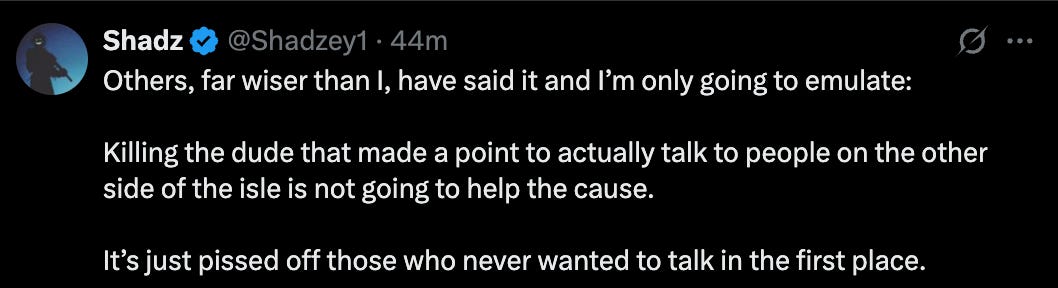 Discussion in large part is over now. There is no common ground to be had with those who celebrate this. I for one, have no interest in trying to debate, speak with, or be around the people who were okay with this happening to Kirk or worse — cheering it on.
