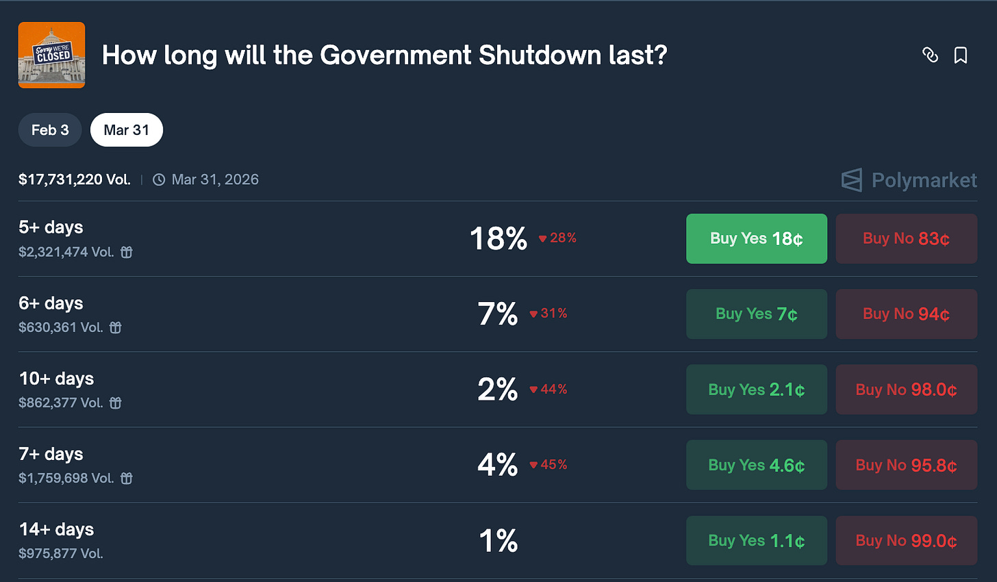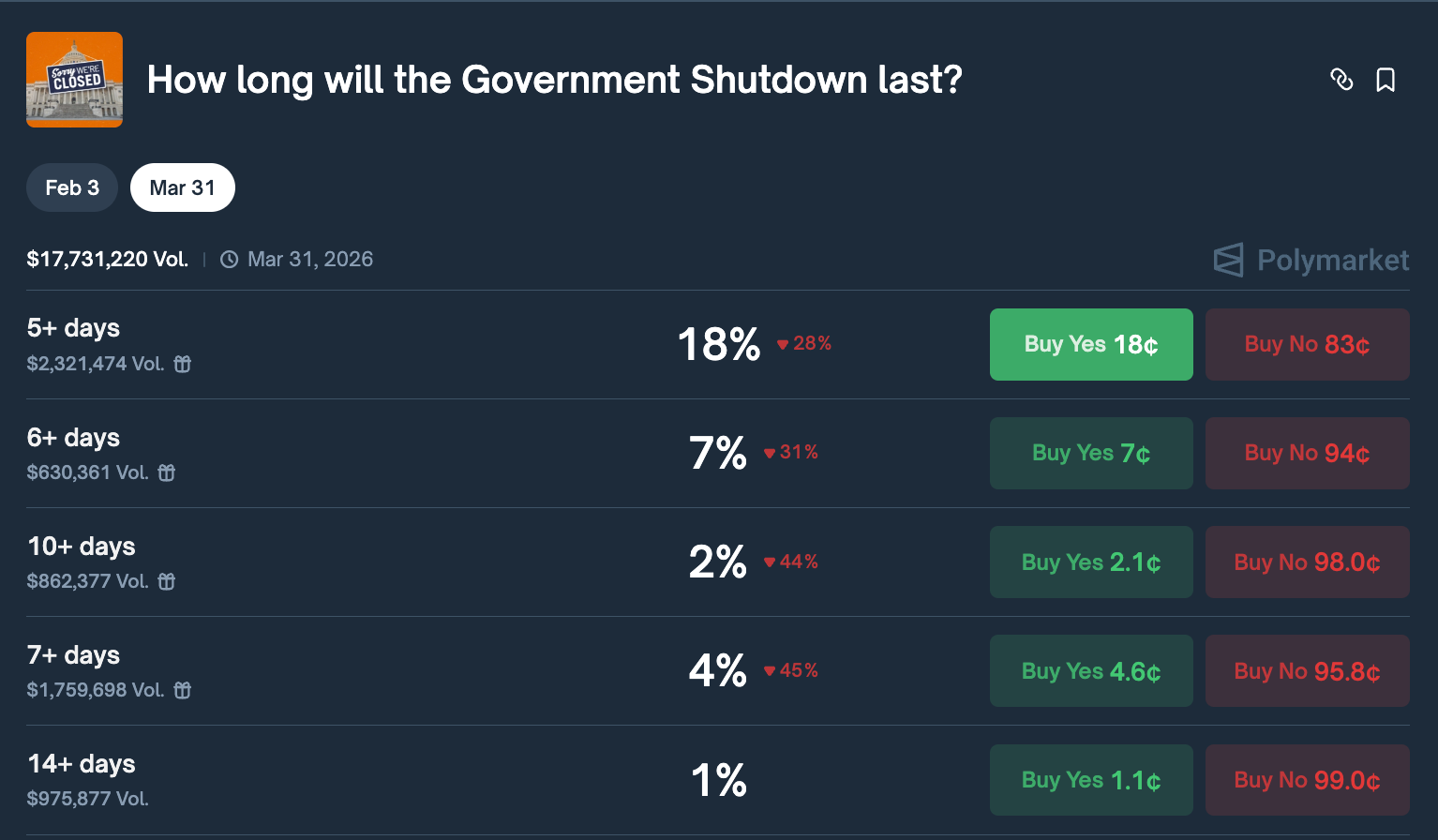 You can check Polymarket odds right now for the duration of this shutdown based on this morning’s data most expect it to last longer than 5 days (18%) right now.