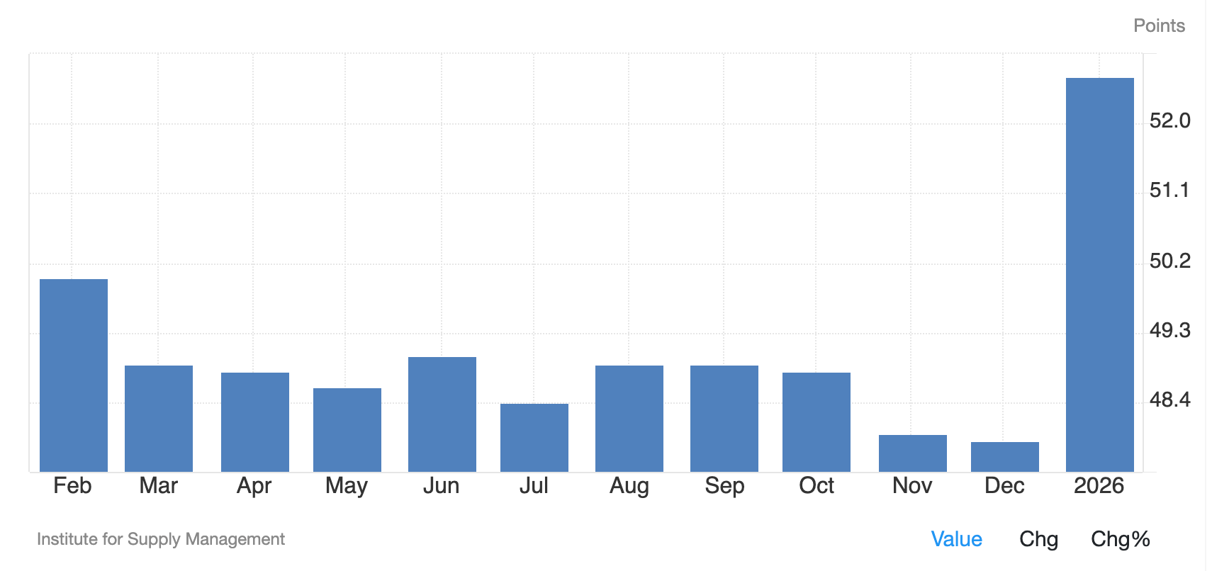 The latest ISM print was stronger than expected and, more importantly, pushed manufacturing back above the 50 level. For those unfamiliar - ISM is the monthly survey from the Institute for Supply Management that tracks U.S. manufacturing and services activity, with readings above 50 generally signaling economic expansion and below 50 signaling contraction.