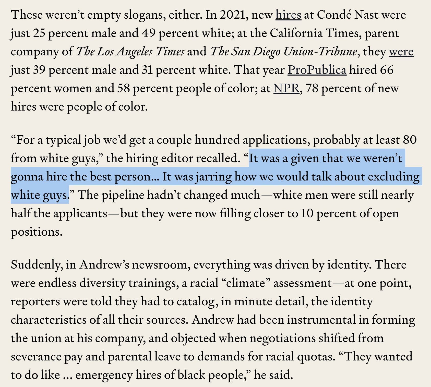 When it comes to the intersection of DEI, wokeness, and business Jacob Savage in CompactMag dropped an insane article this week that dives into the last 10 years of discriminatory hiring practices across the job world.