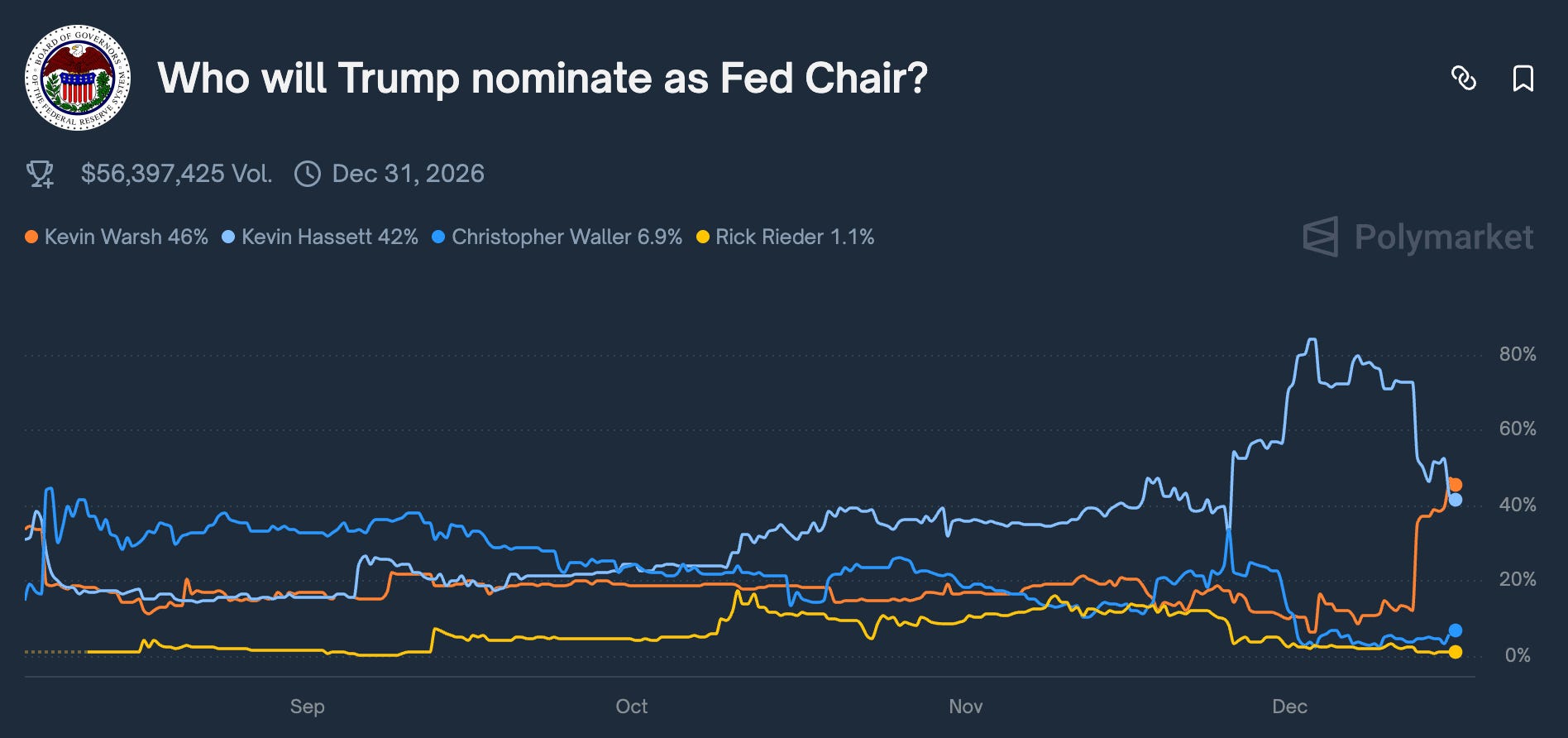 Polymarket odds are now shifting again with Kevin Warsh pulling ahead of Kevin Hassett as Trump’s soon to be Fed chair nomination.